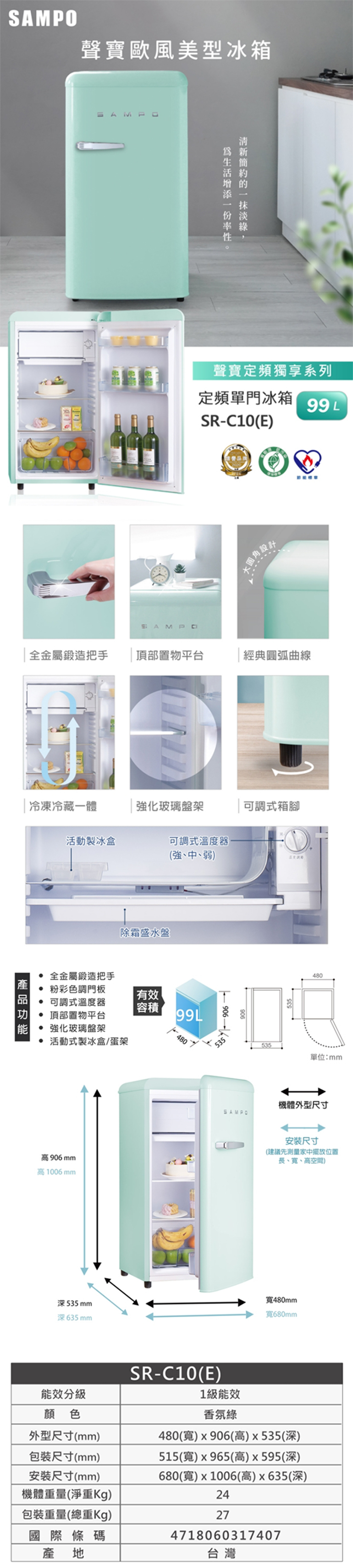 【不含安裝】[SAMPO 聲寶]99公升 一級能效歐風美型單門小冰箱 SR-C10-E