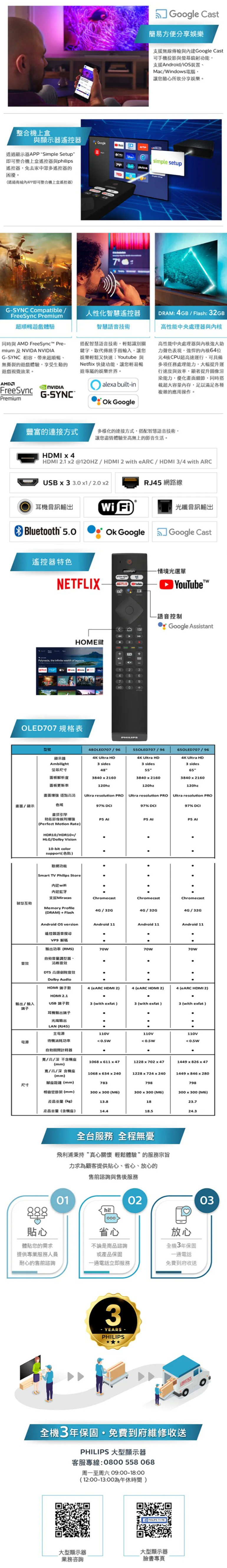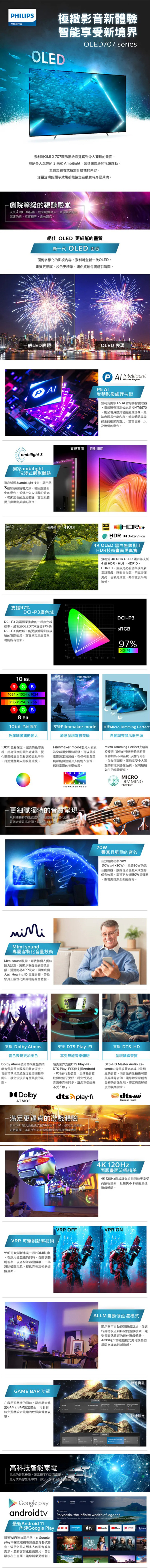 【不含安裝】[PHILIPS 飛利浦]55型4K 120Hz OLED AI安卓聯網顯示器 55OLED707