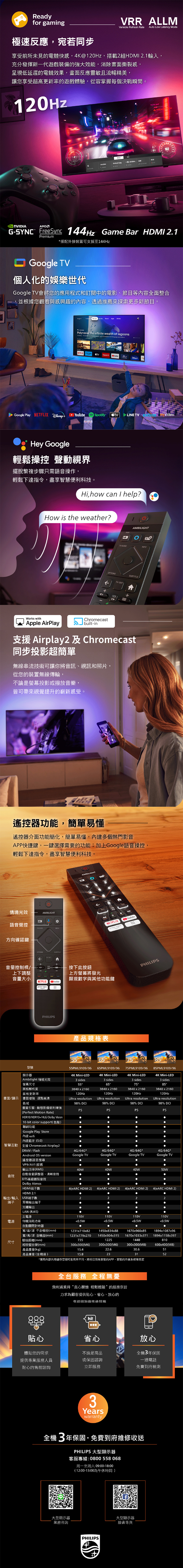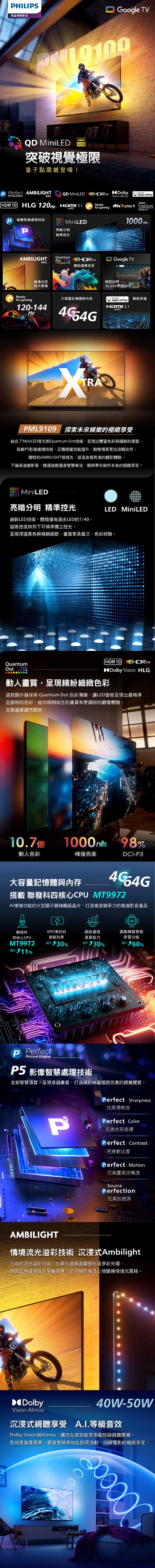 【不含安裝】[PHILIPS 飛利浦]55型4K QD Mini LED 144Hz VRR Google TV 智慧顯示器 55PML9109