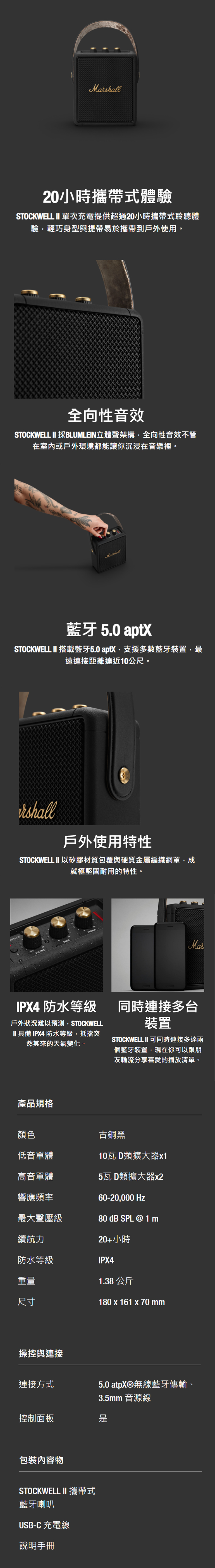 ★ 承襲傳奇ROCK ‘N’ ROLL精神,STOCKWELL II 金屬編織網罩向舞台上的麥克風致敬,便於攜帶的提帶靈感則取自吉他,矽膠材質且具備IPX4防水等級,打造其堅固耐用性,不管目的地在哪,STOCKWELL II 都會是最佳旅伴。