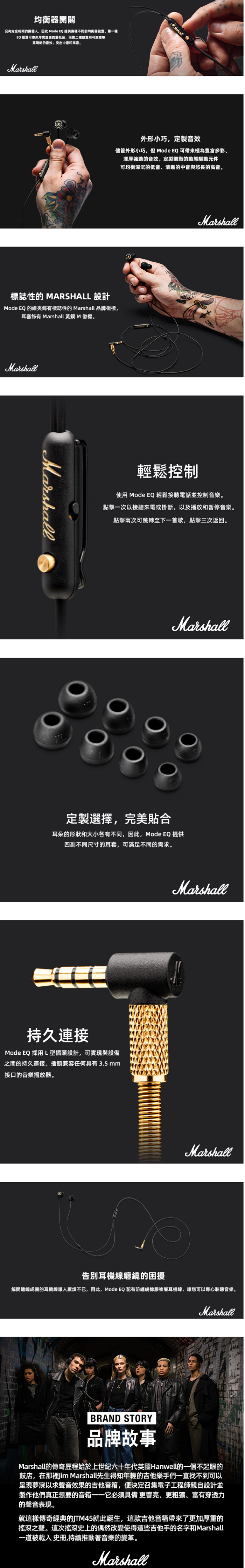 Mode EQ 的線夾飾有標誌性的 Marshall 品牌徽標,耳塞飾有 Marshall 黃銅 M 徽標。