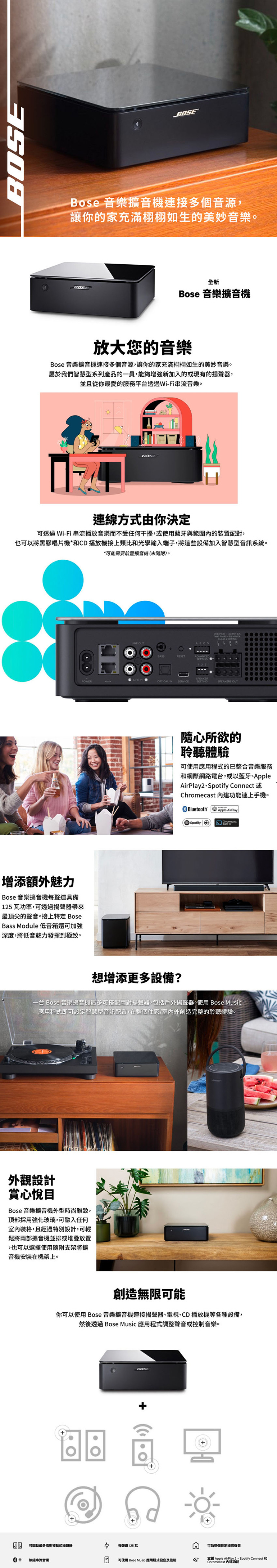 可透過 Wi-Fi、藍牙、類比與光學線性輸入端子、Apple Airplay、Spotify Connect、Chromecast 內建功能串流播放內容