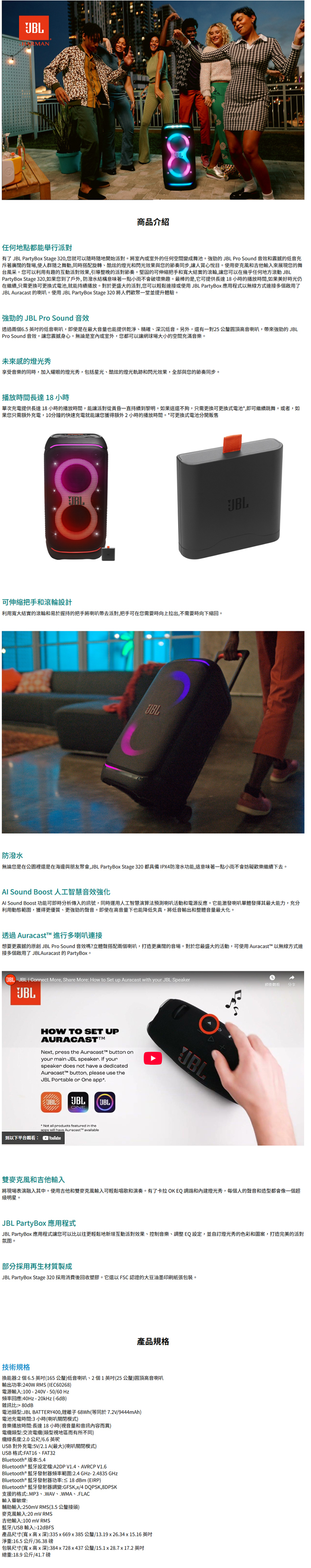任何地點都能舉行派對 / 強勁的 JBL Pro Sound 音效 / 未來感的燈光秀 / 播放時間長達 18 小時 / 可伸縮把手和滾輪設計 / 防潑水 / AI Sound Boost(人工智慧音效強化) / 透過 Auracast™ 進行多喇叭連接 / 雙麥克風和吉他輸入 / JBL PartyBox 應用程式 / 部分採用再生材質製成