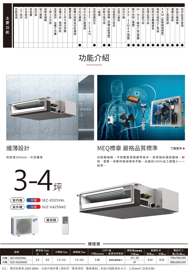【不含安裝】[MITSUBISHI 三菱]3-4坪 一對一家用 吊隱式冷暖空調 SEZ-KD25VAL.TH_SUZ-KA25NA2