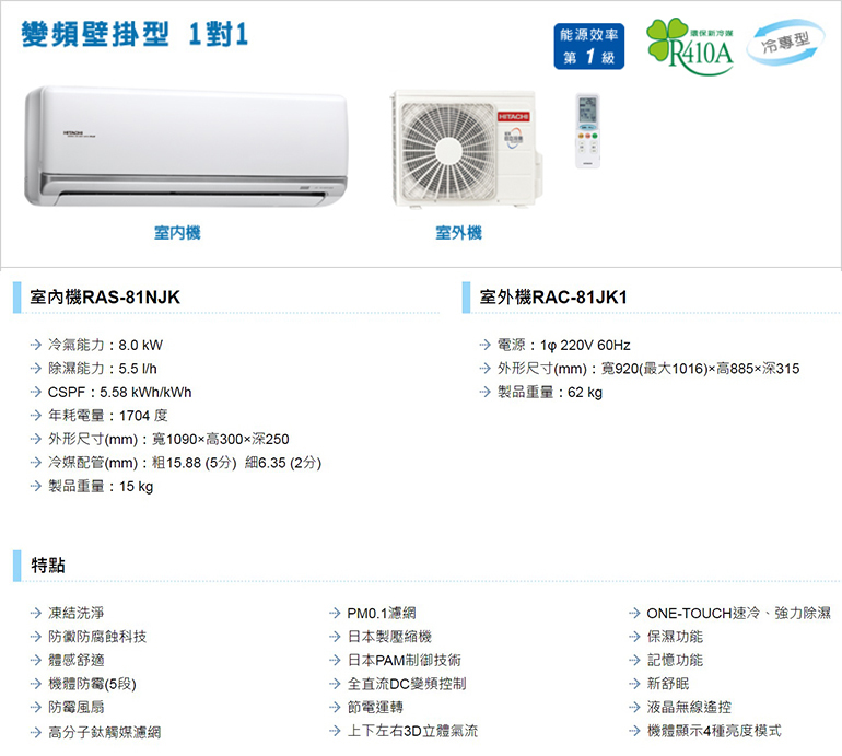 [HITACHI 日立]11坪 頂級N系列 變頻冷專型 分離式冷氣 RAS-81NJK_RAC-81JK1