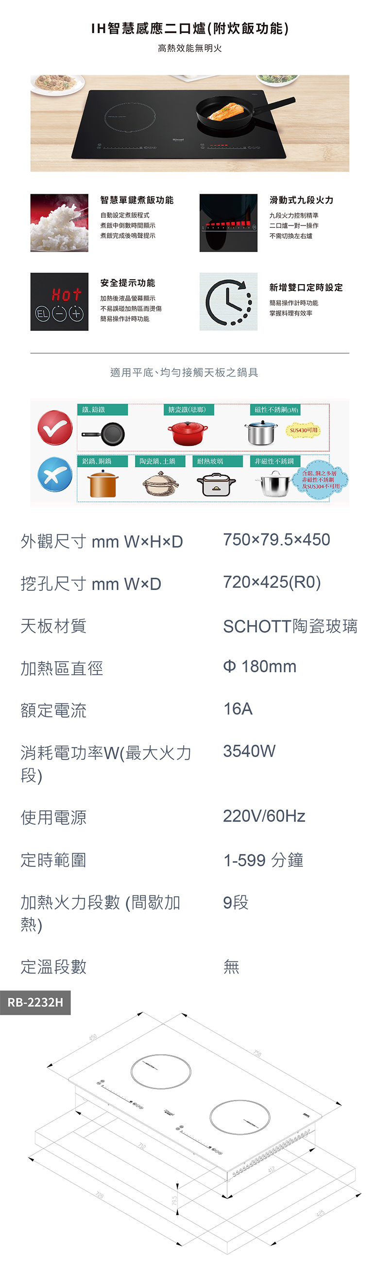 [Rinnai 林內]IH智慧感應雙口爐(附炊飯功能) RB-2232H