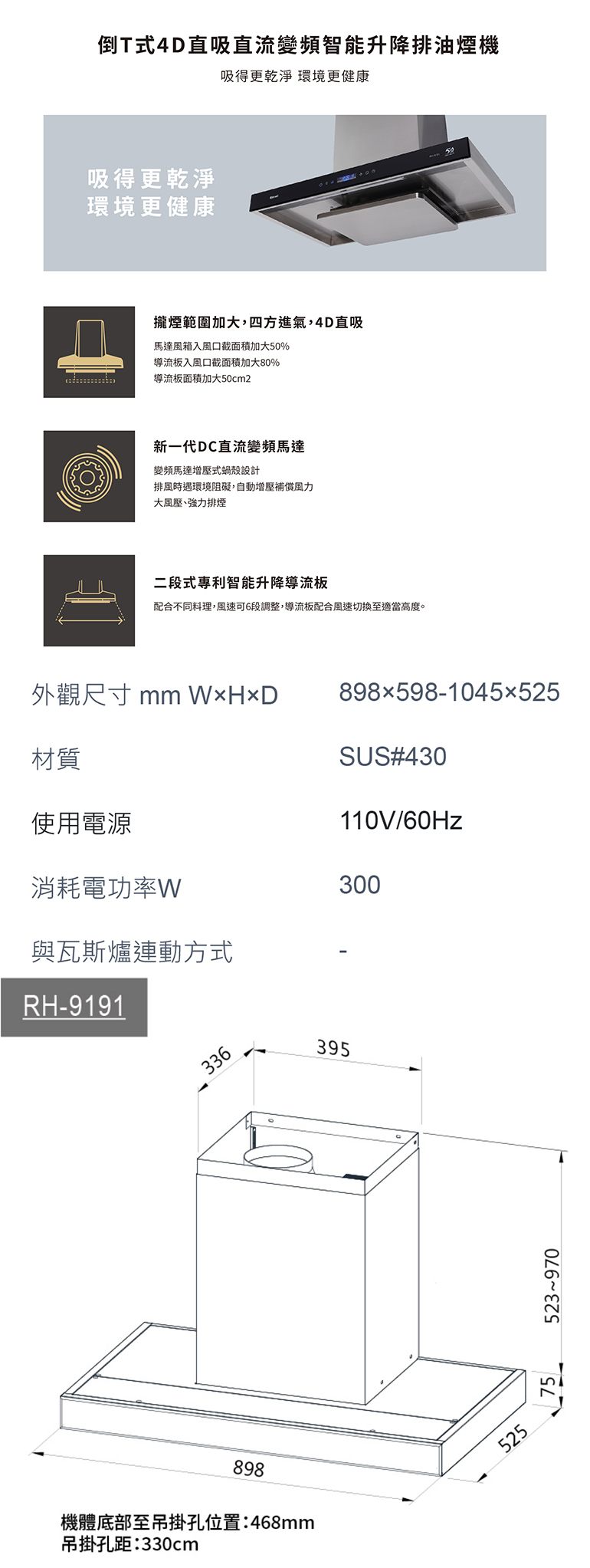 [Rinnai 林內]倒T式智能升降導流設計排油煙機 RH-9191