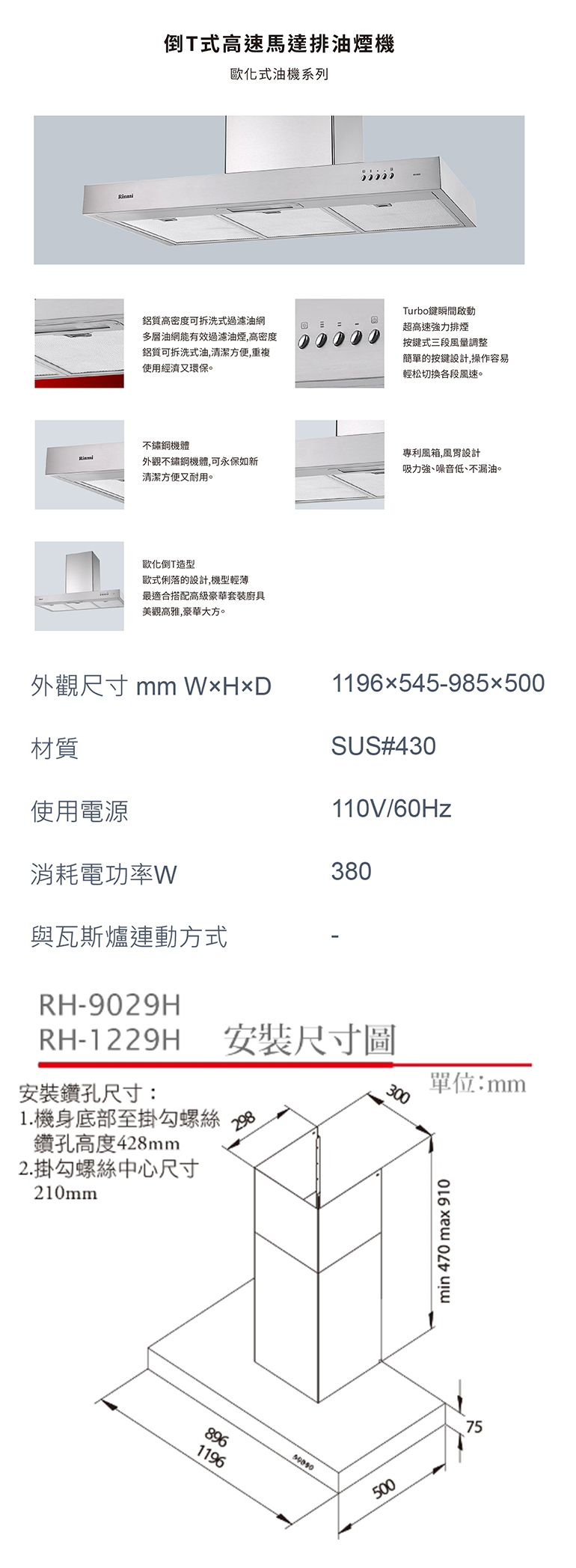[Rinnai 林內]倒T式高速馬達排油煙機 RH-1229H