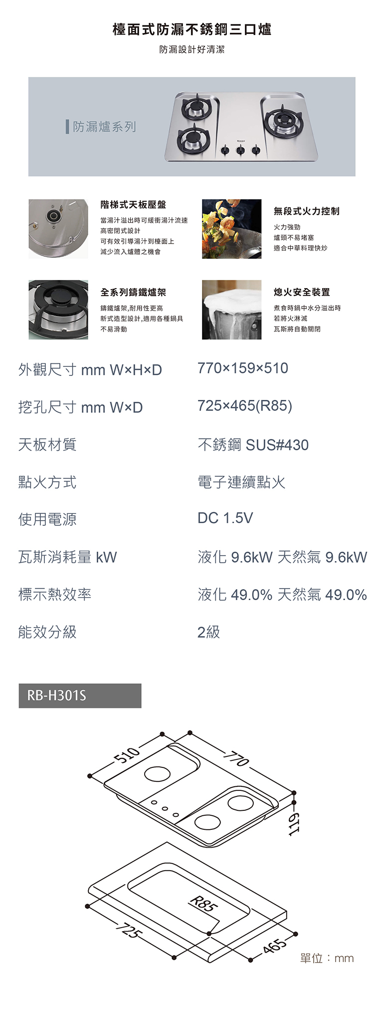 [Rinnai 林內]檯面式防漏不銹鋼三口爐 RB-H301S