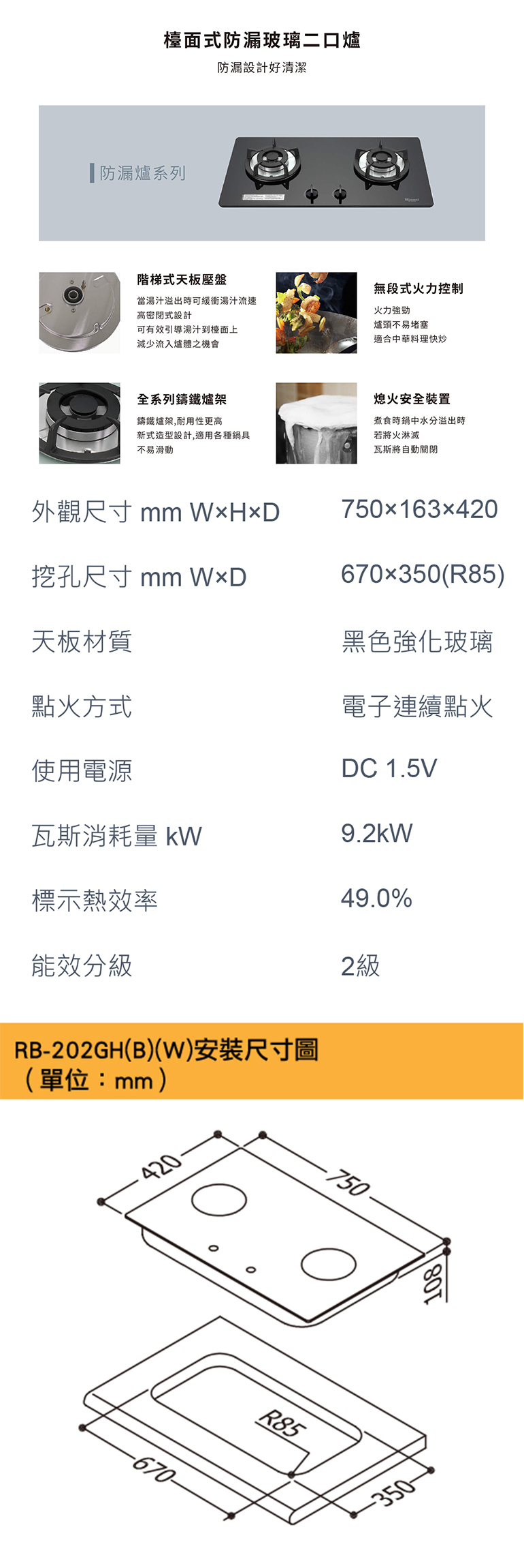[Rinnai 林內]檯面式防漏玻璃雙口爐 RB-202GH(B)