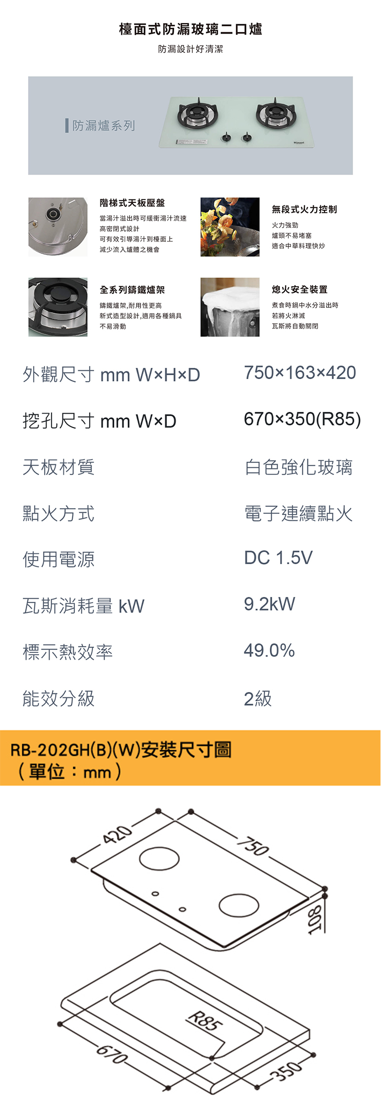 [Rinnai 林內]檯面式防漏玻璃雙口爐 RB-202GH(W)