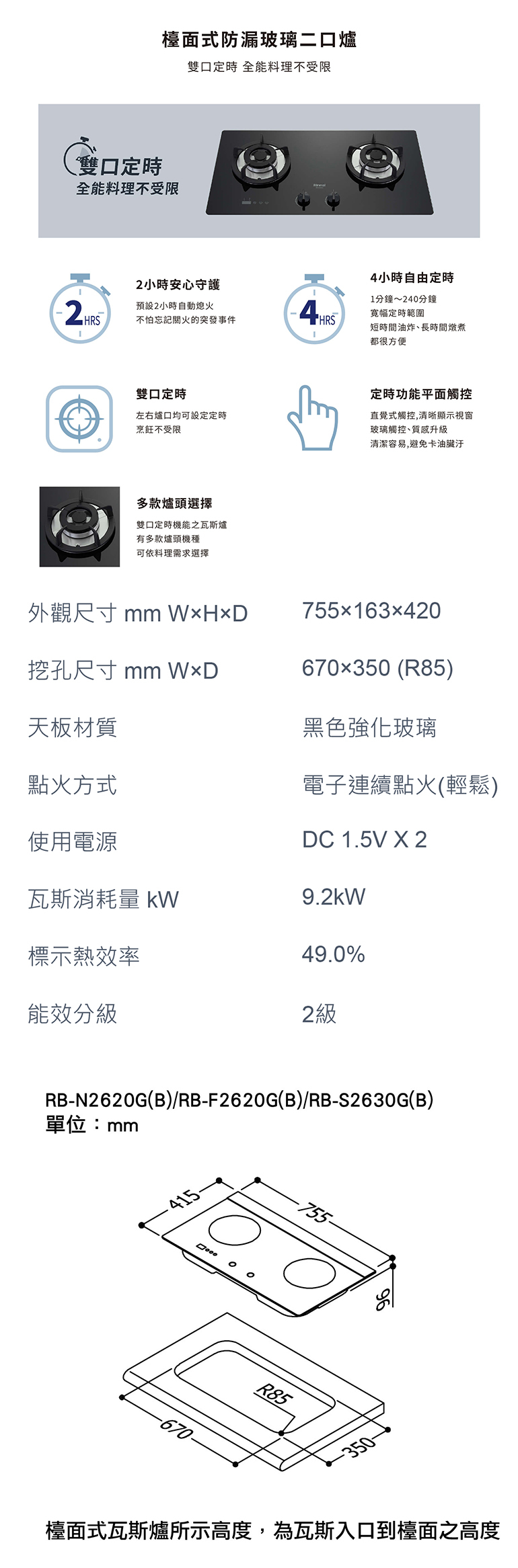 [Rinnai 林內]檯面式防漏玻璃雙口爐 RB-S2630G(B)