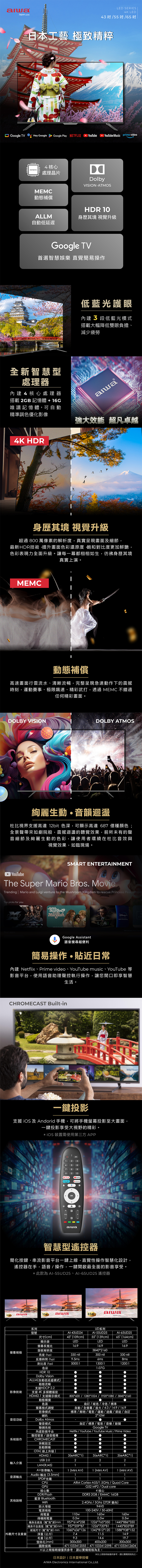 智慧聯網與語音遙控:內建Google TV,支援Netflix、YouTube等主流串流平台,附語音遙控器,操作直覺方便。