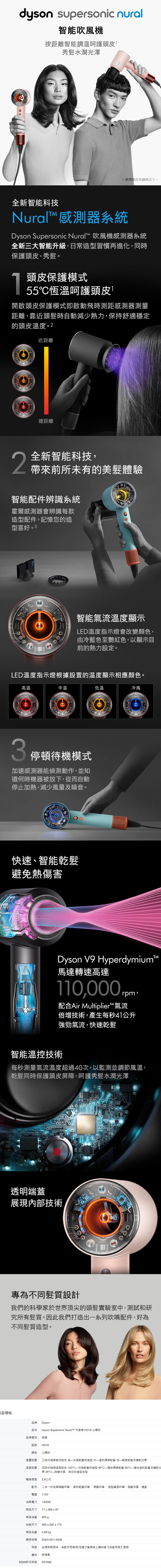 這款智慧吹風機運用創新Dyson科技,不論是以透明端蓋、LED 膠囊燈顯示,或隱藏在手柄中。