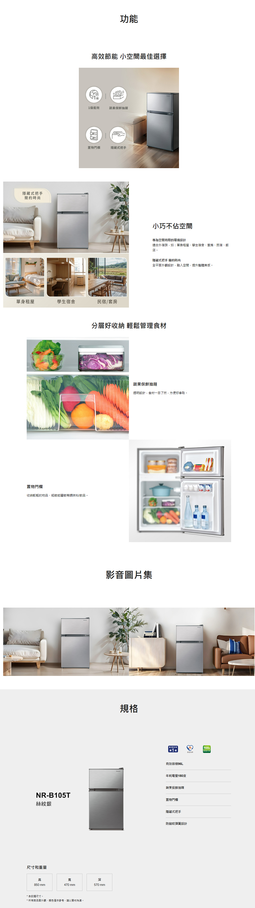 Panasonic 國際牌 96(L) 1級定頻2門無邊框鋼板電冰箱 NR-B105T-S 絲紋銀【送基本安裝】