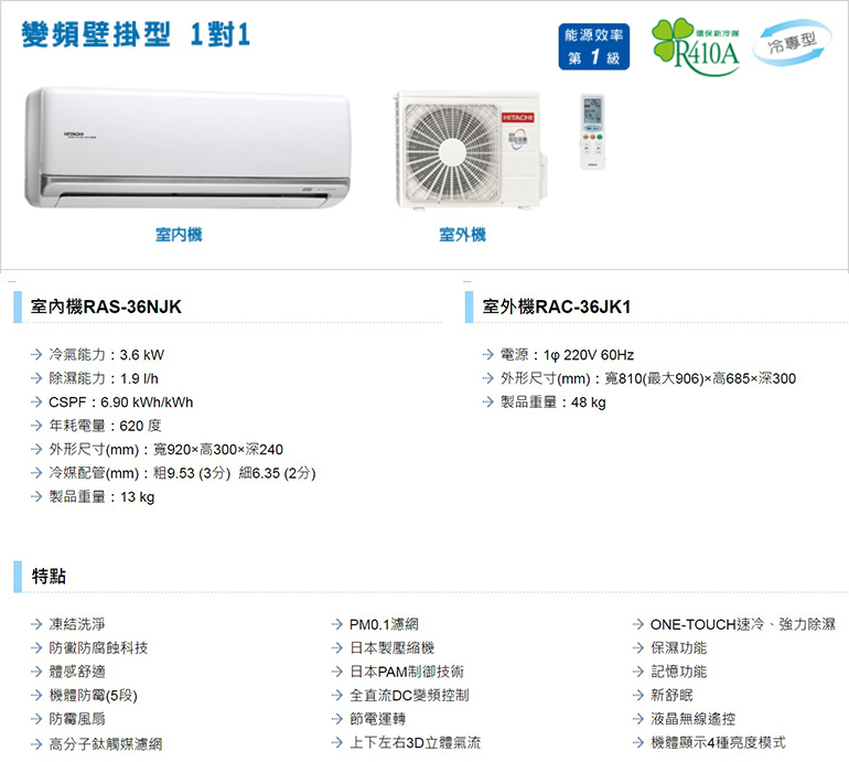 [HITACHI 日立]4-6坪 頂級N系列 變頻冷專型 分離式冷氣 RAS-36NJK_RAC-36JK1