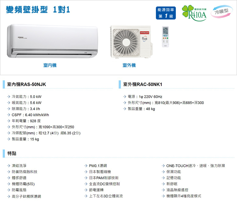 [HITACHI 日立]6-8坪 頂級N系列 變頻冷暖型 分離式冷氣 RAS-50NJK_RAC-50NK1