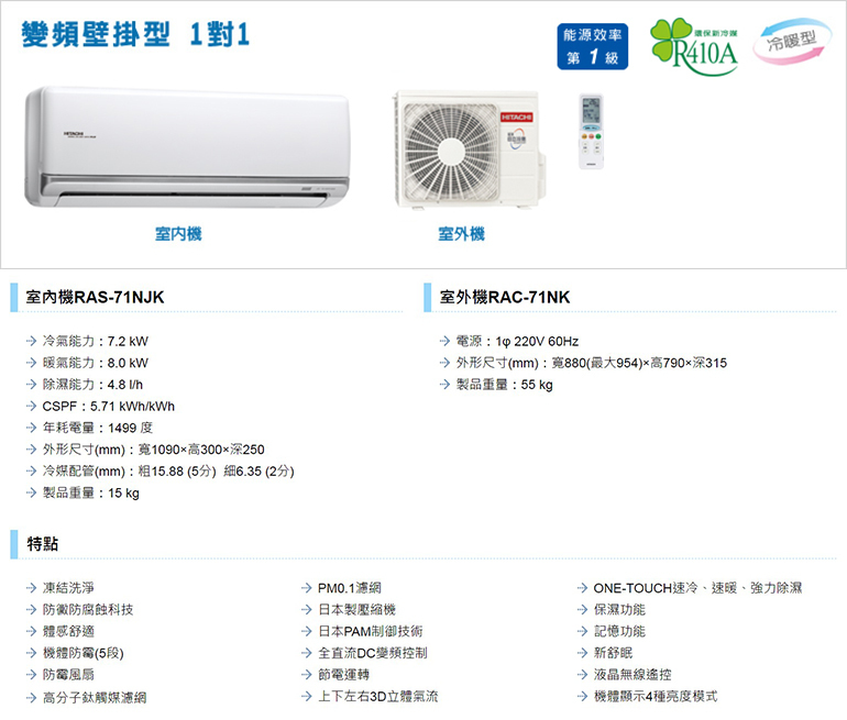 [HITACHI 日立]8-10坪 頂級N系列 變頻冷暖型 分離式冷氣 RAS-71NJK_RAC-71NK