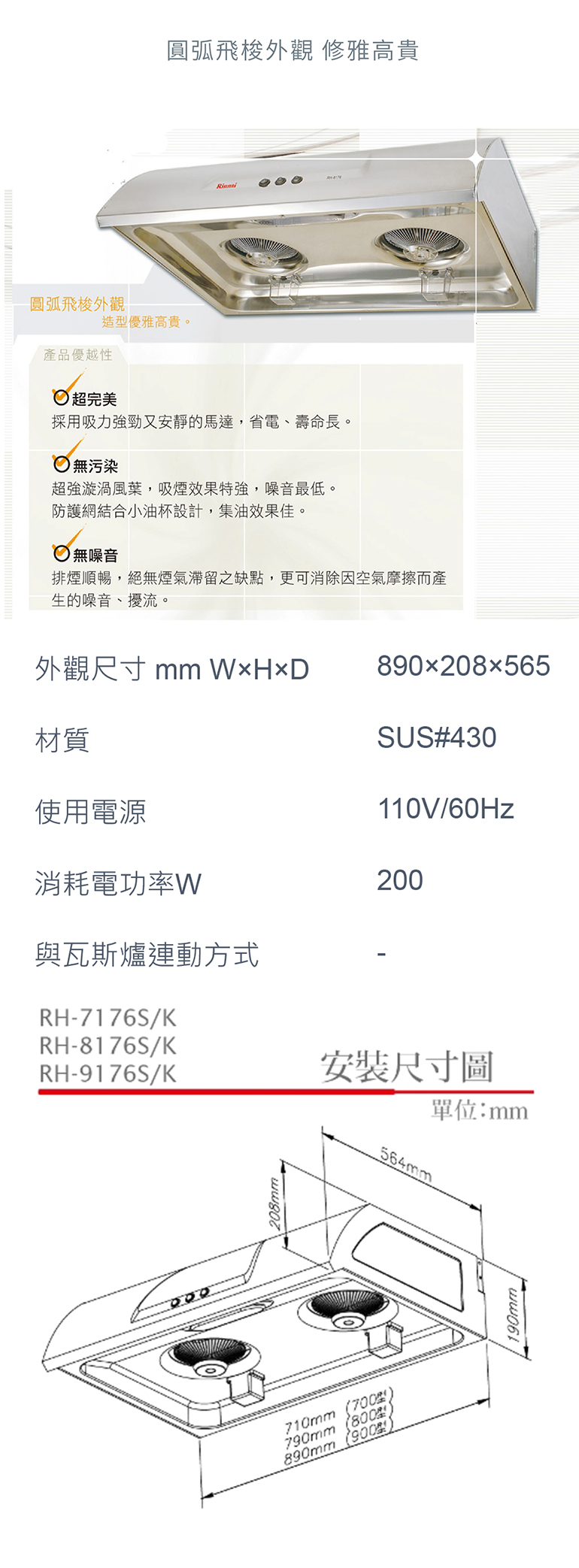 [Rinnai 林內]圓弧式典雅輕巧排油煙機 RH-9176S