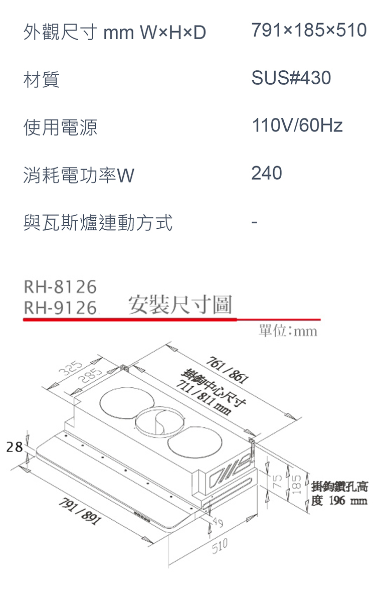 [Rinnai 林內]隱藏式電熱除油排油煙機 RH-8126E