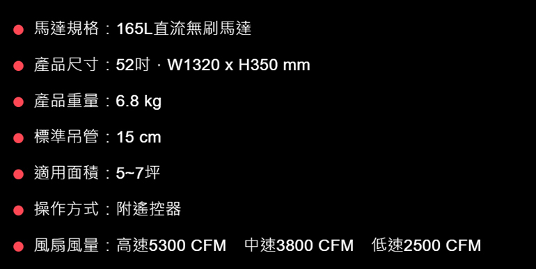 ●風扇風量:高速5300 CFM 中速3800 CFM 低速2500 CFM