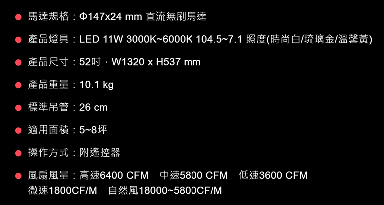 ●風扇風量:高速6400 CFM、中速5800 CFM、低速3600 CFM