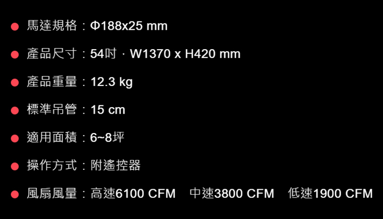 ●風扇風量:高速6100 CFM 中速3800 CFM 低速1900 CFM
