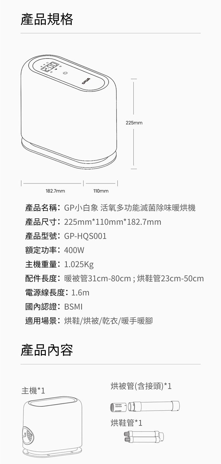 產品內容:主機*1/說明書*1/烘鞋管*1/暖被管*1/暖被管接頭*1