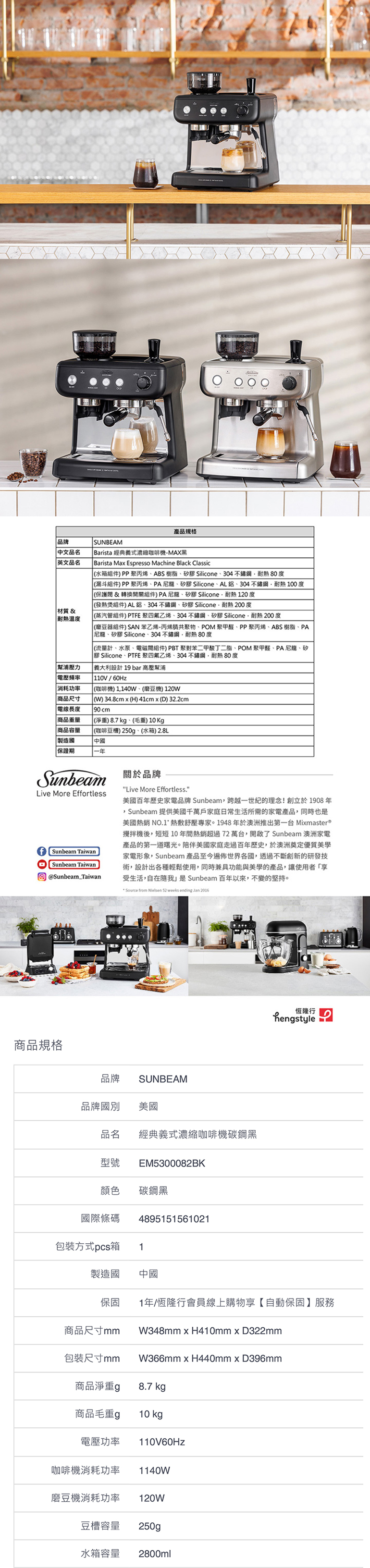 實用配件:58毫米咖啡手柄,填壓器,460ml不鏽鋼杯,2個濾網(單份和雙份),清潔針,清潔小刷子