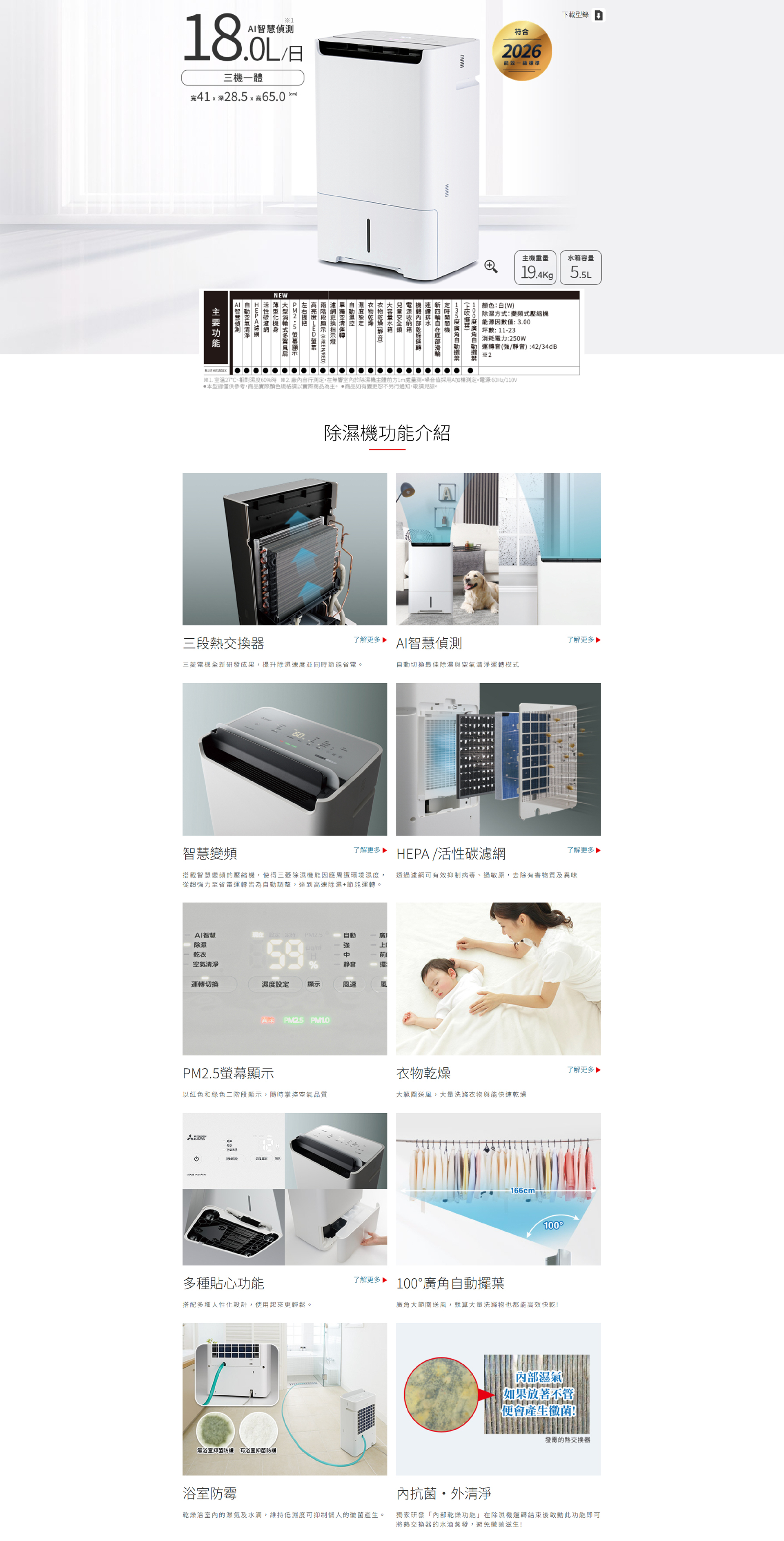 -搭載變頻及獨家三段熱交換器,具除濕/清淨/除臭三合一功能