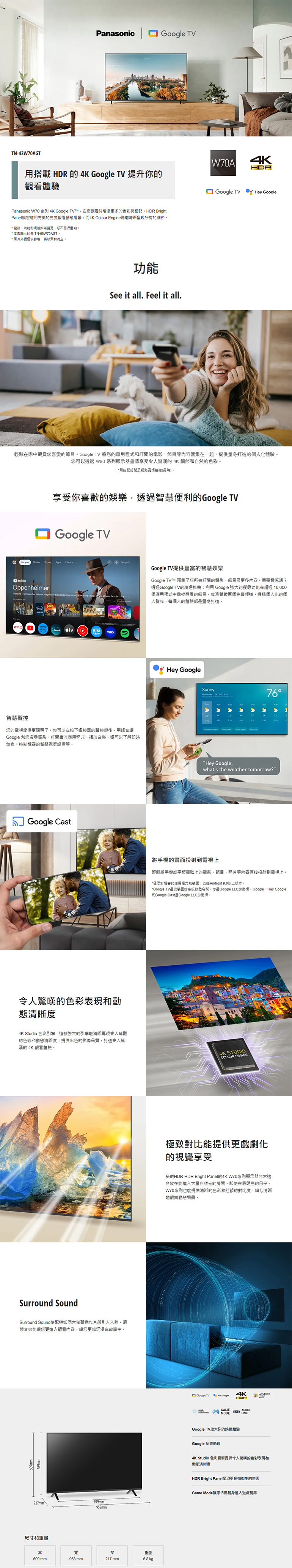 Panasonic W70 系列 4K Google TV™,在您觀看時增添更多的色彩與細節。HDR Bright Panel讓您能用完美的亮度觀看動態場景,而4K Colour Engine則能清晰呈現所有的細節。