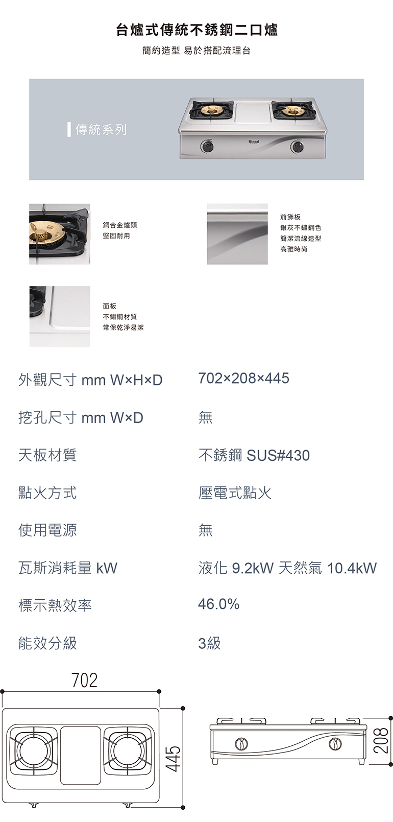 [Rinnai 林內]台爐式傳統不銹鋼雙口爐 RTS-203SC